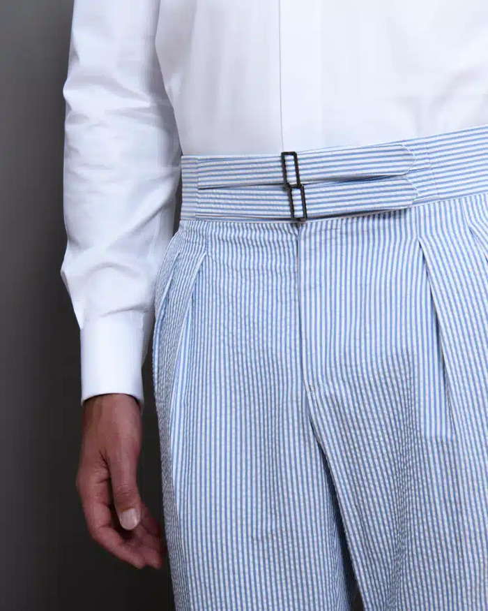 Cette construction permet d’obtenir une silhouette harmonieuse, sans tension au niveau du bassin. Il ne faut pas la confondre avec le pli marqué au fer le long de la jambe, qui ne joue qu’un rôle visuel. Dans un pantalon sur mesure, la pince est ajustée au millimètre pour accompagner le mouvement et garantir un tombé impeccable.